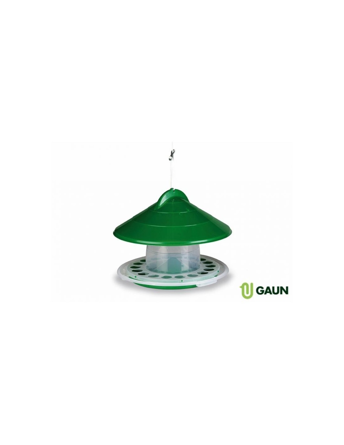 Tolva para pájaros de 2 kg. Gaun Tolva Pájaros es un comedero tipo tolva para pájaros, diseñado con forma de caseta de base circular. Tiene varios agujeros, lo que permite que coman varias aves al mismo tiempo. El formato de tolva garantiza un suministro constante de alimento limpio, que se conserva fresco en el depósito. Se puede desmontar todo para facilitar la limpieza.